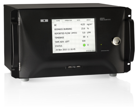 HTabsOverviewBrochure: AE33_spec_sheet.pdf Information: THE DUALSPOT™ MEASUREMENT METHOD The Aethalometer® AE33 incorporates the patented DualSpot™ measurement method. This completely solves the loading-dependent nonlinearity, which affects the data from any filter-based optical analyzer. The method explicitly does not require any knowledge or assumption about the existence, origin, or magnitude of any optical nonlinearity. In fact, the calculation yields the “Loading Compensation Parameter” as an instrumental data output, which may offer insights into the origins and optical properties of the aerosol. 7-WAVELENGTH OPERATION: UV-IR, 1HZ DATA The analysis is performed at 7 optical wavelengths spanning from the near-infrared (950 nm) to the near-ultraviolet (370 nm). The sequencing of illumination and analysis is performed on a 1-Hz timebase. This yields the complete spectrum of aerosol optical absorption with one data line every second. REAL-TIME SOURCE APPORTIONMENT An Aethalometer model (Sandradevi et.al. from 2007) is used in real-time to calculate the fraction of BC that may be attributed to biomass combustion. CALIBRATION AND IN-FIELD VALIDATION The optical performance of the Aethalometer® AE33 may be validated by the ‘Neutral Density Optical Filter Kit,’ consisting of four precision optical elements whose absorbance is traceable to fundamental standards. Software routines measure the optical intensities at all wavelengths and compare the analysis instantly with the original reference values. Other built-in test programs offer routine checks of stability and leakage. These features provide Quality Assurance that is essential both for routine monitoring and research use. USER AND COMMUNICATIONS INTERFACES User and communications interfaces permit remote monitoring of operation; data retrieval; performance of internal tests; and reporting of state-of-health parameters. SpecificationMeasurement Parameter: Black CarbonBiomassSource ApportionmentWood Fire SmokeFossil Fuel EmissionsSpecification: OPERATION Supply voltage: 100-240 V~, 50/60 Hz Max power consumption: 90 W. Typical power consumption: 25 W Measurement wavelengths: 370, 470, 520, 590, 660, 880 and 950 nm Air flow: set-points of 2, 3, 4 and 5 LPM ENVIRONMENTAL OPERATING CONDITIONS Indoor or sheltered use only: the AE33 is not weatherproof. Altitude: up to 3000 m with an internal pump. Increased flow at very high altitudes possible with the external pump on request. Temperature range: 10 – 40 degrees Celsius (instrument) Relative humidity range: non-condensing. Note that it is essential to prevent condensation of humid outdoor sample air if the instrument is located in a chilled (air-conditioned) environment. MECHANICAL SPECIFICATION Chassis material: sheet metal Dimensions: standard 19”/6U, rack mount Weight: approx. 20 kg CONNECTORS Sampling air: inlet/outlet type – ¼” NTPF Communication: 3x USB type A, 3x COM, 1x Ethernet USER INTERFACE 8.4” SVGA display with LED backlight Basic control: touch-screen Optional control: standard PC keyboard and mouse via front-panel USB ports. Red, Yellow, Green status LEDs Further InfoFurther Info: Maintenance information can be found in the following short videos prepared by Aerosol Magee Scientific on Neutral density optical validation, leakage testing, flow verification, flow calibration, filter tap installation and stability and clean air check. Development of the AE33 was supported by the Eurostars initiative, More information may accessed by following this link Documents: AE33_spec_sheet.pdfEmbedded video for Aethalometer® AE33Embedded video for Aethalometer® AE33Embedded video for Aethalometer® AE33Embedded video for Aethalometer® AE33Embedded video for Aethalometer® AE33Embedded video for Aethalometer® AE33Embedded video for Aethalometer® AE33Embedded video for Aethalometer® AE33Embedded video for Aethalometer® AE33Embedded video for Aethalometer® AE33Embedded video for Aethalometer® AE33